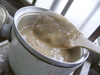 じっくりと炊き上げ程よい加減になれば糊こしおけでうらごしします。