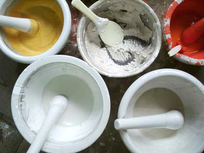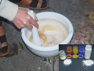 糊こしで不純物を無くし、雲母や胡粉、顔料を調合し色調を整えます。