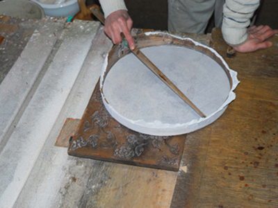 版面に置いた紙の裏面を手の平で、円を描くように撫でて柄をつけていきます。