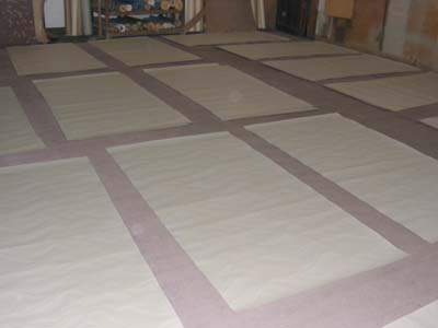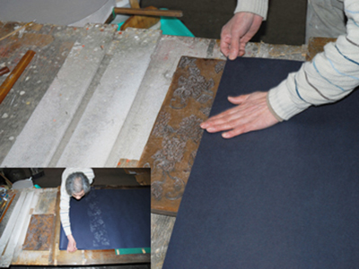 先程擦った紙をめくって、篩の絵の具を再度版木に移します。すなわち、同じ模様を同じ個所に2度摺ることになります。これは、より質感を高めふっくらとあたかかみのある風合いに仕上げる為です。