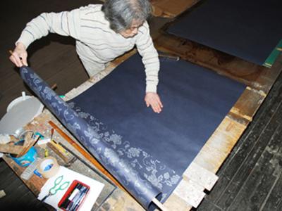 襖判などの大判は12回版木を置き換えながら連続模様を摺るので、予めキリでつけた印に合わせて紙を置いていきます。
