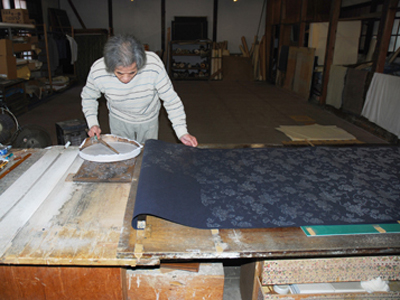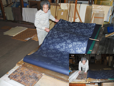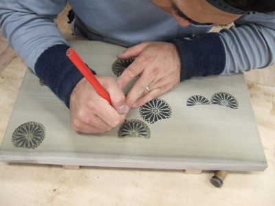 あらかじめスクリーン型で版下作成したものを、木版に摺ります。総柄など連続した柄は、版木の左右上下の柄がうまく合うよう様に、合口を考えたデザインにしなければなりません。