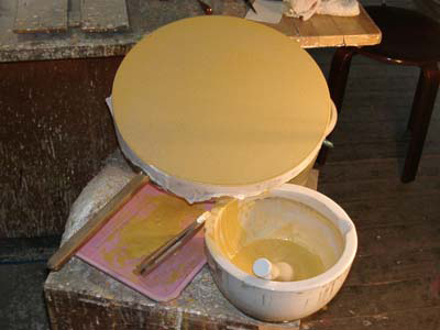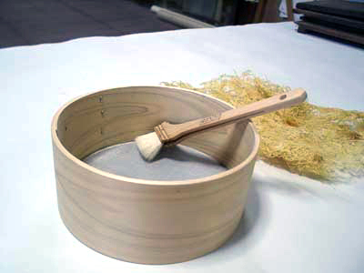 唐紙独特の道具。杉などの細長い薄板をまるめた枠に寒冷紗やガーゼを張ったものです。これを使って絵具を版木に移します。