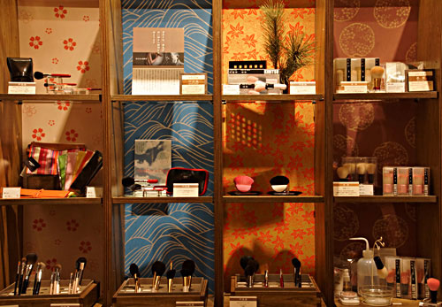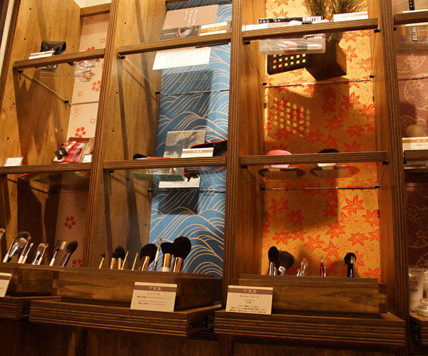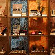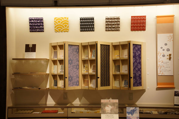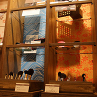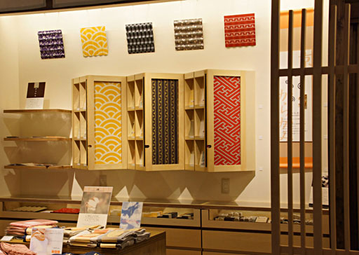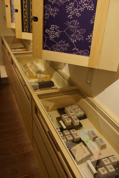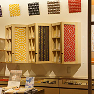 店舗什器ということで、本来控えめなからかみも文様らしさが出るよう、紙色と摺り色にこだわりました。